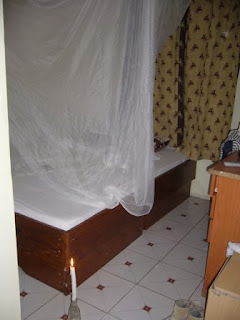 お部屋は、学生調査・旅行時代にあちらこちらで泊まっていたゲストハウスたちと、まさに瓜二つ。でも安いし、清潔だし、タオルも石鹸もトイレットペーパーもついているし、蚊帳も張ってあるし。唯一の問題は、せっかくお湯が出る蛇口がついていても、5分起きに停電になるもんで、もちろんお湯は出ず。ひさびさの水シャワー(キリマンジャロ麓は、結構寒い)、かつてのタイ生活を思い出して、足元から少しずつ上に向かって水を浴びていく、と若干寒さを凌げる(タイ時代は、なおかつシャワー浴びる前にジョギングして、汗だくになっておく)、という技を使いながら、結構Exciteしている自分がいました。やっぱ、これだよね~、みたいな(笑)。蝋燭の灯だけで眠るのも、悪くない。